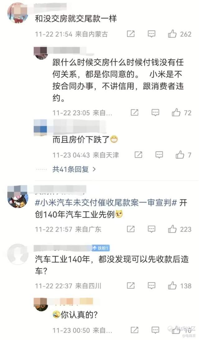除此之外,小米“未交付车辆却要求消费者提前支付尾款”的操作,前段时间引发了大众热议。