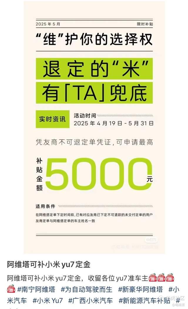 此前,小米YU7刚上市的时候,智己、蔚来、极氪、智界、阿维塔等品牌花式截胡雷军的订单。下单了小米YU7定金的用户,如果转买其他品牌的车,就会有相应的“补偿”,称“愿意为YU7用户提供退订补齐定金的福利。”