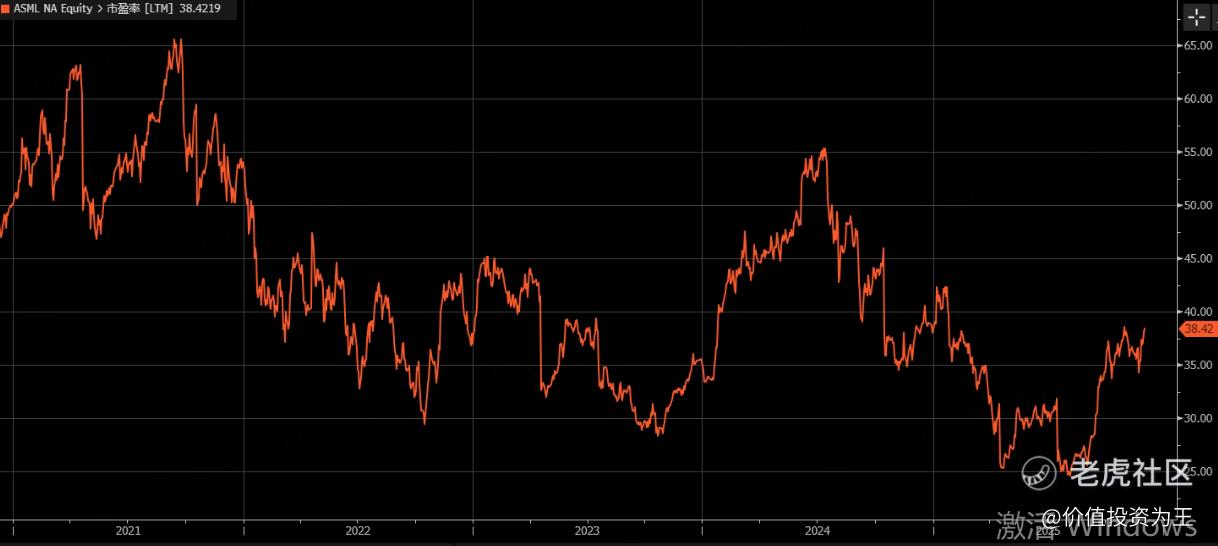 由于之前半导体设备公司股价表现疲软,因此估值都处于低位,像阿斯麦,即使股价历史新高,当前市盈率也不过38倍,处于近年来的低位: