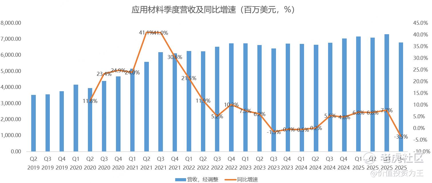 应用材料的表现就更差了,25财年四季度营收同比下滑3.5%,预计当前季度营收继续下滑,下滑幅度扩大至4.4%: