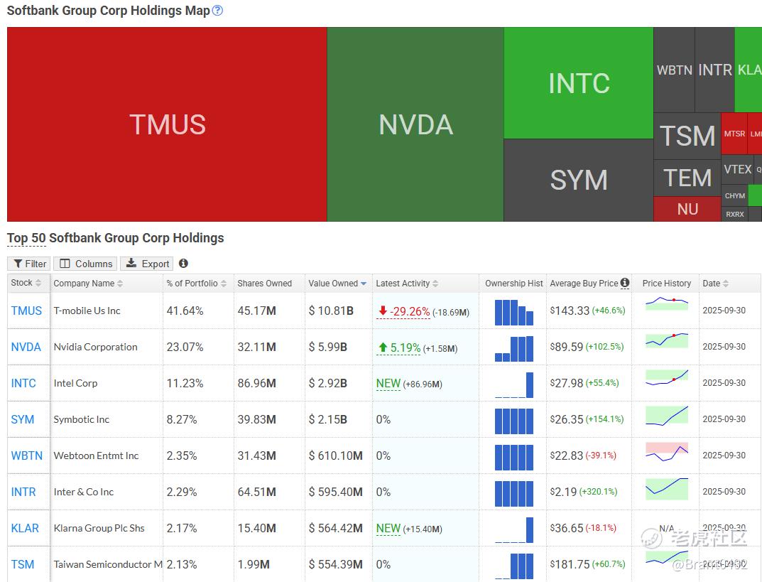而在清仓英伟达之前的Q3(截止2025年9月30日),软银的投资组合TOP 10仓位如下: