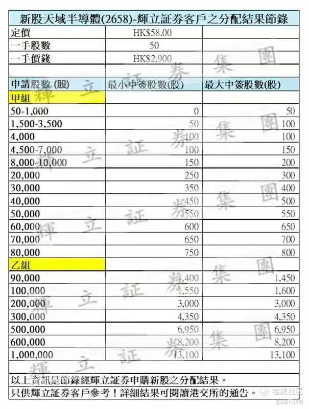 天域半导体(2658)出分配结果了,30手稳中1手,甲尾15-16手,乙头28-29手;定价:58,一手50股;货有点多,抛压有些大,开始拼手速了,具体分析可以看看上一篇文章,只做参考,不做投资买卖建议。