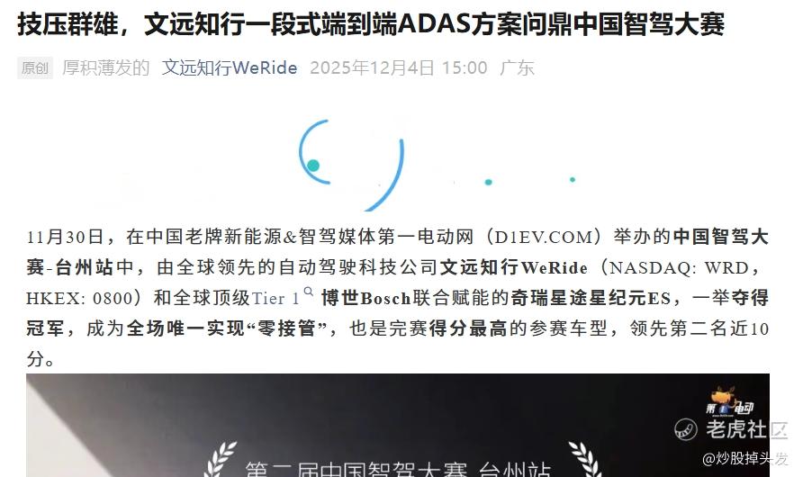 {"i18n":{"language":"zh_CN"},"detailType":1,"isChannel":false,"data":{"magic":2,"id":507198268204096,"tweetId":"507198268204096","gmtCreate":1764858386146,"gmtModify":1764859870721,"author":{"id":3585111100146944,"idStr":"3585111100146944","authorId":3585111100146944,"authorIdStr":"3585111100146944","name":"炒股掉头发","avatar":"https://static.tigerbbs.com/19f104b99dcb1ed48655208dc8e73ea0","vip":1,"userType":1,"introduction":"","boolIsFan":false,"boolIsHead":false,"crmLevel":1,"crmLevelSwitch":0,"individualDisplayBadges":[],"fanSize":1,"starInvestorFlag":false},"themes":[],"images":[{"img":"https://static.tigerbbs.com/f44720222f855aecc802de66ee14469f","width":"892","height":"530"}],"coverImages":[{"img":"https://static.tigerbbs.com/f44720222f855aecc802de66ee14469f","width":"892","height":"530"}],"title":"","html":"<html><head></head><body><p><a href=\"https://laohu8.com/S/WRD\">$文远知行(WRD)$ </a> 智驾大赛排名第一!!</p><img src=\"https://static.tigerbbs.com/f44720222f855aecc802de66ee14469f\" tg-width=\"892\" tg-height=\"530\"></body></html>","htmlText":"<html><head></head><body><p><a href=\"https://laohu8.com/S/WRD\">$文远知行(WRD)$ </a> 智驾大赛排名第一!!</p><img src=\"https://static.tigerbbs.com/f44720222f855aecc802de66ee14469f\" tg-width=\"892\" tg-height=\"530\"></body></html>","text":"$文远知行(WRD)$ 智驾大赛排名第一!!","highlighted":1,"essential":1,"paper":1,"likeSize":1,"commentSize":0,"repostSize":0,"favoriteSize":0,"link":"https://laohu8.com/post/507198268204096","repostId":0,"isVote":1,"tweetType":1,"viewCount":300,"commentLimit":10,"likeStatus":false,"favoriteStatus":false,"reportStatus":false,"symbols":["WRD","00800"],"verified":2,"subType":0,"readableState":1,"langContent":"CN","currentLanguage":"CN","warmUpFlag":false,"orderFlag":false,"shareable":true,"causeOfNotShareable":"","featuresForAnalytics":[],"commentAndTweetFlag":false,"andRepostAutoSelectedFlag":false,"upFlag":false,"length":33,"optionInvolvedFlag":false,"xxTargetLangEnum":"ZH_CN"},"commentList":[],"isCommentEnd":true,"isTiger":false,"isWeiXinMini":false,"url":"/m/post/507198268204096"}