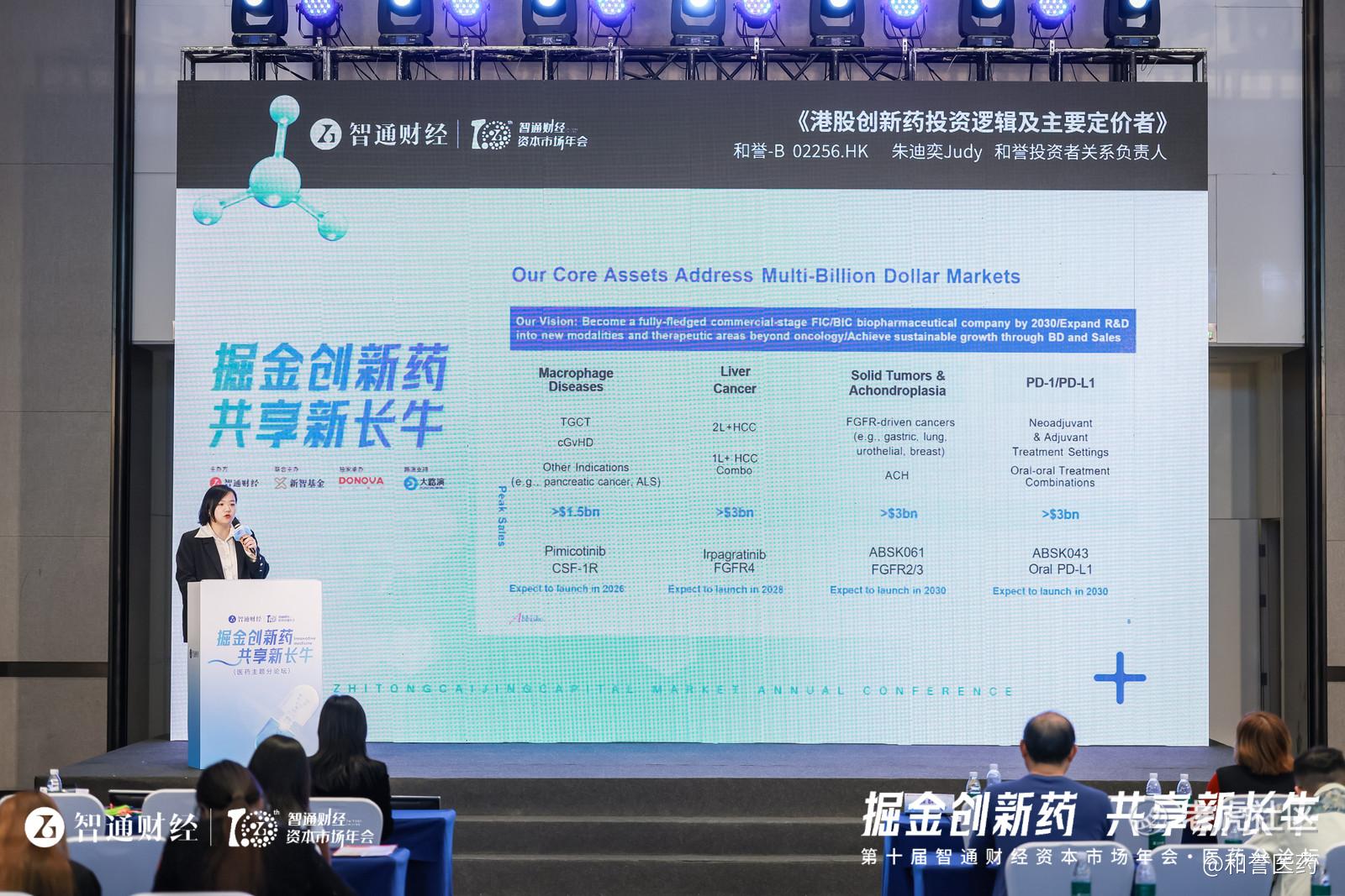 在颁奖典礼当天下午的医药分会场上,朱迪奕女士发表了题为“港股创新药投资逻辑及主要定价者”的主题演讲,深入分析了当前港股创新药领域的估值体系变化、机构投资者的决策偏好、市场定价的核心驱动力,以及影响港股创新药长期价值重估的关键因素。同时,她结合和誉医药自身的管线布局及研发进展,与现场投资者与行业专家分享了公司在价值创造、国际化推进及资本市场沟通方面的最新实践与思考。