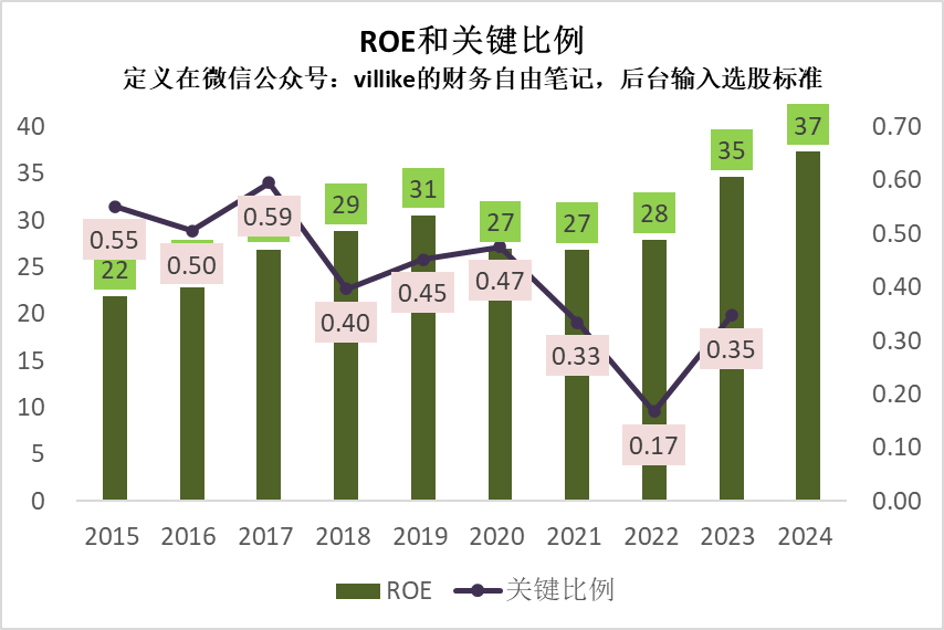 下图中的数据来源于wind,2024年数据没导出来,实际上2024年利润22亿,分红也是22亿,分红比例差不多100%,哪怕当年ROE高达37%,关键比例也就是0.37左右,这就是我的关键比例这个指标的好处,可以综合看盈利性和成长性。