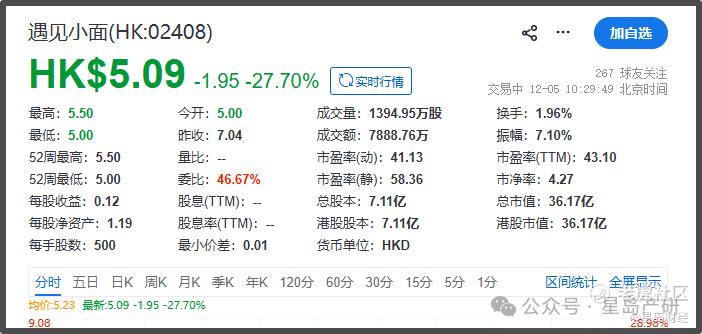 12月5日正式挂牌当天,遇见小面延续破发态势,以5港元/股开盘,此后便迅速跌超25%。截至5日上午10点30分,遇见小面股价报5.09港元/股,跌幅27.70%,总市值36.17亿港元。