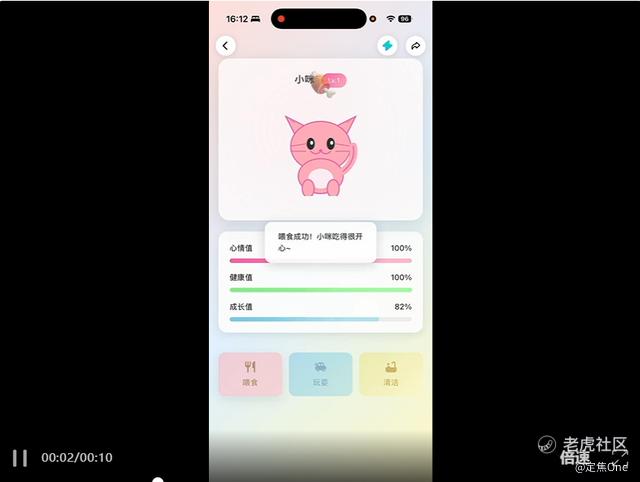 这只粉色的小猫能对喂食、清洁等操作做出实时反应,心情值、健康值等数据均以可视化方式呈现。如果你想把猫的品种换成布偶,只需再追加修改指令,就能完成替换。从制作到迭代的全过程,都不用编写一行代码。