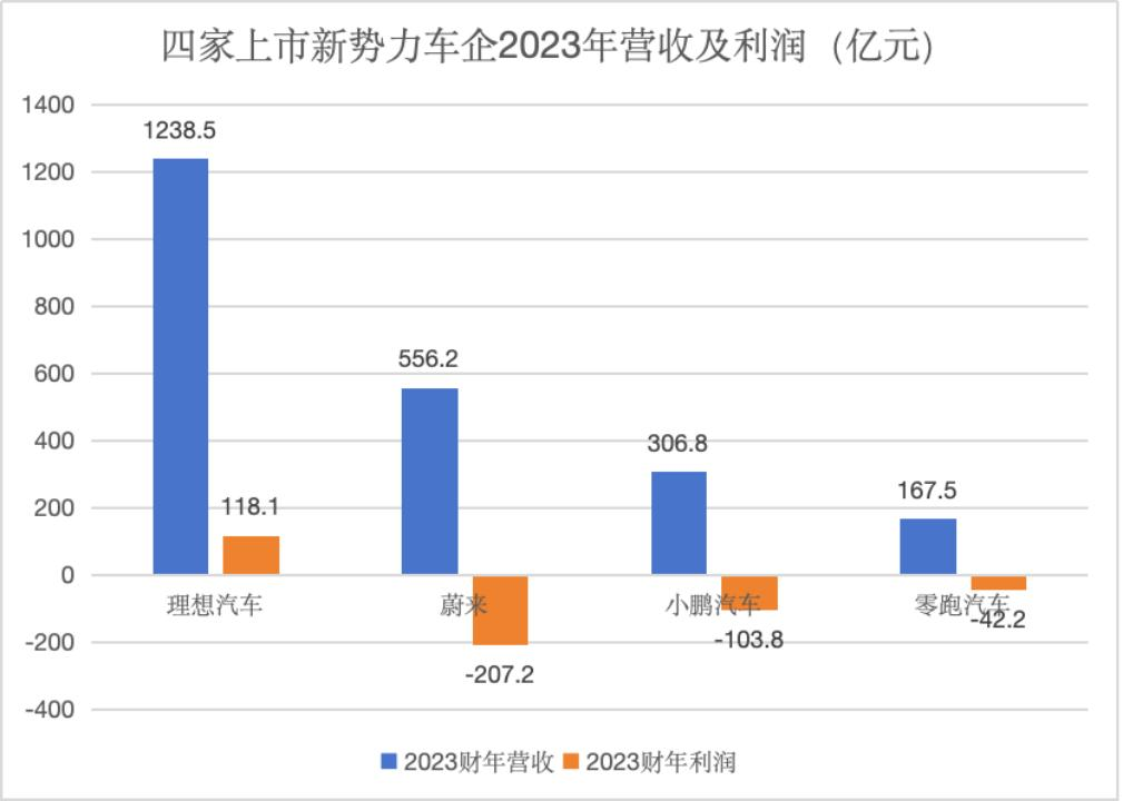2023年除理想实现年盈利外,蔚来、小鹏、零跑三家新势力巨头均处于亏损状态,零跑汽车年净亏损42.16亿元,小鹏汽车年亏损103.8亿元,蔚来年亏损207.2亿元,近乎是小鹏汽车的两倍。