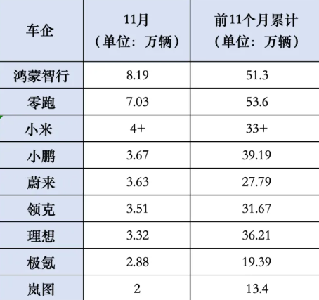 鸿蒙智行创新高、零跑持续突破7万辆、“蔚小理”交付量排名重新排序……车企分化加剧,金九银十销售旺季之后,11月国内车市面临一定提前透支的压力。