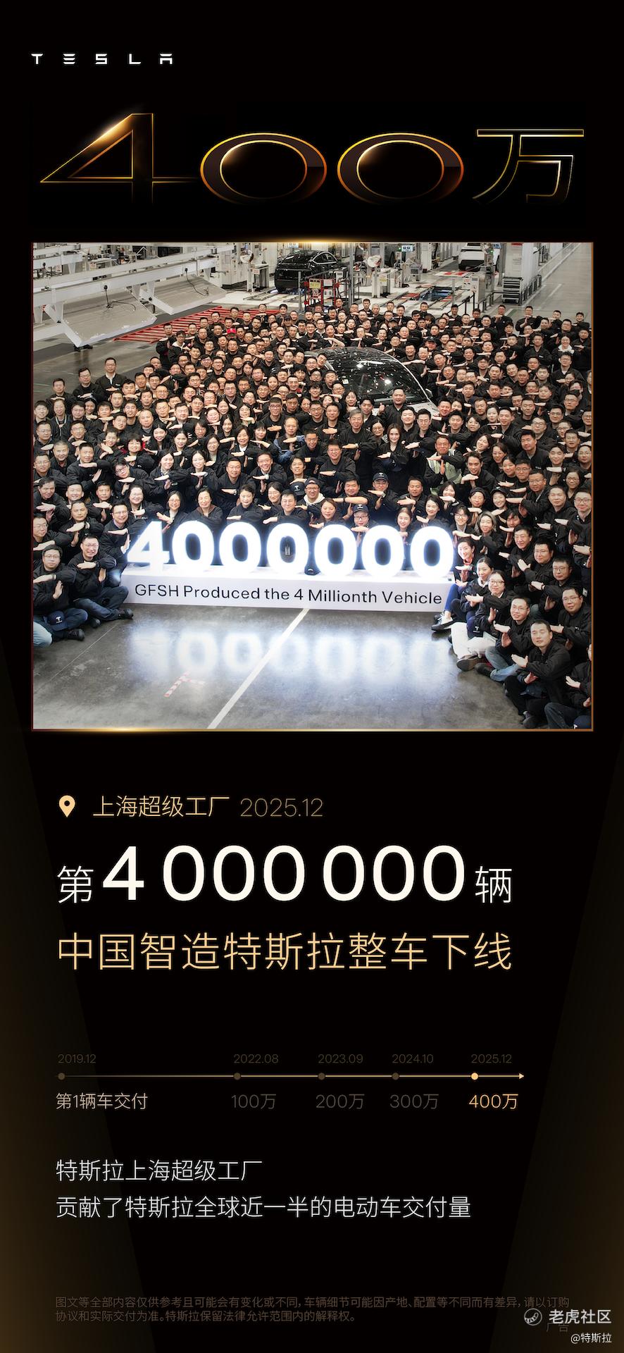 {"i18n":{"language":"zh_CN"},"detailType":1,"isChannel":false,"data":{"magic":2,"id":508492701221056,"tweetId":"508492701221056","gmtCreate":1765174317544,"gmtModify":1765174331853,"author":{"id":3562909664933798,"idStr":"3562909664933798","authorId":3562909664933798,"authorIdStr":"3562909664933798","name":"特斯拉","avatar":"https://static.tigerbbs.com/c97d09ce1f3268f15e9bd8d11f045f8c","vip":5,"userType":5,"introduction":"特斯拉官方","boolIsFan":false,"boolIsHead":false,"crmLevel":1,"crmLevelSwitch":0,"individualDisplayBadges":[],"fanSize":431830,"starInvestorFlag":false},"themes":[],"images":[{"img":"https://static.tigerbbs.com/57119d366467d5104d88a2bc3027be45","width":"886","height":"1920"}],"coverImages":[{"img":"https://static.tigerbbs.com/57119d366467d5104d88a2bc3027be45","width":"886","height":"1920"}],"title":"","html":"<html><head></head><body>第400万辆中国智造特斯拉正式下线🎉\n<br>\n<br>\n从300万到400万,只用了不到14个月\n<br>\n6年间,上海超级工厂贡献了\n<br>\n特斯拉全球近一半的电动车交付量🏭\n<br>\n<br>\n第400万辆的主角🚗星光金 Model Y L\n<br>\n作为中国智造的代表作,从设计到生产\n<br>\n用全能驾乘体验诠释“处处皆从容”\n<br>\n<br>\n感谢每一位“400万分之一”和所有支持我们的人<span class=\"teditor-emoji\">[爱心]</span>\n<br>\n下一程,我们继续全速前进🦾 <img src=\"https://static.tigerbbs.com/57119d366467d5104d88a2bc3027be45\" tg-width=\"886\" tg-height=\"1920\"></body></html>","htmlText":"<html><head></head><body>第400万辆中国智造特斯拉正式下线🎉\n<br>\n<br>\n从300万到400万,只用了不到14个月\n<br>\n6年间,上海超级工厂贡献了\n<br>\n特斯拉全球近一半的电动车交付量🏭\n<br>\n<br>\n第400万辆的主角🚗星光金 Model Y L\n<br>\n作为中国智造的代表作,从设计到生产\n<br>\n用全能驾乘体验诠释“处处皆从容”\n<br>\n<br>\n感谢每一位“400万分之一”和所有支持我们的人<span class=\"teditor-emoji\">[爱心]</span>\n<br>\n下一程,我们继续全速前进🦾 <img src=\"https://static.tigerbbs.com/57119d366467d5104d88a2bc3027be45\" tg-width=\"886\" tg-height=\"1920\"></body></html>","text":"第400万辆中国智造特斯拉正式下线🎉 从300万到400万,只用了不到14个月 6年间,上海超级工厂贡献了 特斯拉全球近一半的电动车交付量🏭 第400万辆的主角🚗星光金 Model Y L 作为中国智造的代表作,从设计到生产 用全能驾乘体验诠释“处处皆从容” 感谢每一位“400万分之一”和所有支持我们的人[爱心] 下一程,我们继续全速前进🦾","highlighted":1,"essential":1,"paper":1,"likeSize":5,"commentSize":0,"repostSize":2,"favoriteSize":0,"link":"https://laohu8.com/post/508492701221056","repostId":0,"isVote":1,"tweetType":1,"viewCount":71451,"commentLimit":10,"likeStatus":false,"favoriteStatus":false,"reportStatus":false,"symbols":["TSLA"],"verified":2,"subType":0,"readableState":1,"langContent":"CN","currentLanguage":"CN","warmUpFlag":false,"orderFlag":false,"shareable":true,"causeOfNotShareable":"","featuresForAnalytics":[],"commentAndTweetFlag":false,"andRepostAutoSelectedFlag":false,"upFlag":false,"length":285,"optionInvolvedFlag":false,"xxTargetLangEnum":"ZH_CN"},"commentList":[],"isCommentEnd":true,"isTiger":false,"isWeiXinMini":false,"url":"/m/post/508492701221056"}