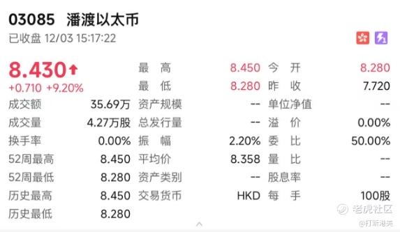 潘渡以太币ETF的上市,给数字资产市场注入了实打实的信心。据港交所2025年12月3日公开交易数据,该ETF首日表现相当亮眼:收盘价8.43港元,较发行价涨幅达9.20%,成交额35.69万港元,最高价触及8.45港元,最低价8.28港元。二级市场投资者抢筹热情高涨,交易活跃度远超预期,这充分说明市场对合规数字资产投资工具的渴望有多强烈。