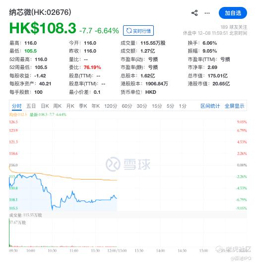 12月8日,模拟芯片设计公司苏州纳芯微电子股份有限公司(下称:纳芯微)正式在港交所主板挂牌上市,并以发行价116港元/股平开,开盘市值约187.45亿港元。截至今日午间休市,纳芯微跌6.64%报108.3港元,总市值约175.01亿港元。
