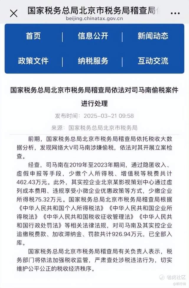 官方通报,司马南在2019年至2023年期间,通过各种手段,少缴个人所得税、增值税等税费共计462.43万元。最终被追缴税费款,加收滞纳金、罚款共计926.94万元。