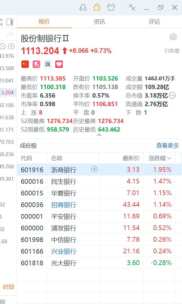 这样对比就知道了,股份制银行会比四大行强,不会玩就玩银行etf就好了,如果打算轮动就可以切换到股份制银行了,先补涨一部分再说了。