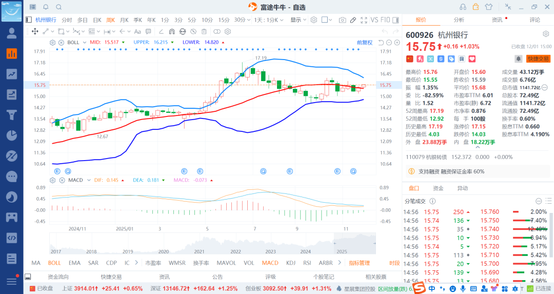 之前就说过a股是大盘股和小盘股的结合,大盘股以金融,小盘股以科技和资源类别,就是半导体和创业板了,而金融是银行,保险,证券,他都是嵌合在一起,之前银行很牛,尤其是四大行,但银行etf还是涨的,而四大行还是亏了,那么特色银行开始要补涨了,这个就是轮动的挨个板块涨,你的找到现在的最优势的板块才行了。