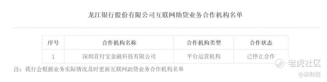 龙江银行公布的最新互联网助贷业务合作机构名单中,仅剩深圳首付宝金融科技有限公司一颗“独苗”,且处于“已停止合作”状态。