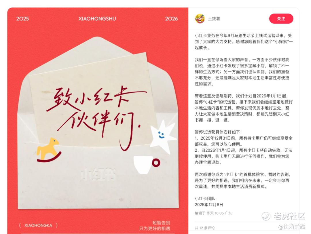 面对上述种种挑战,“小红卡”最终选择急刹车。小红卡团队在最新公告中坦陈:由于准备不够充分,没能满足用户对本地生活丰富性与便捷性的要求,计划自2026年1月1日起暂停小红卡试运营。换句话说,小红书精心构筑的本地生活交易闭环之梦,在运行百日后主动按下了暂停键。