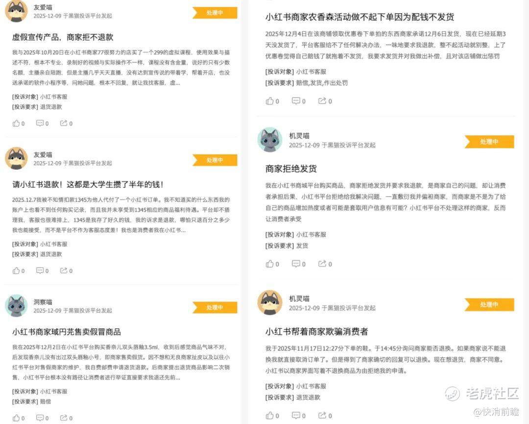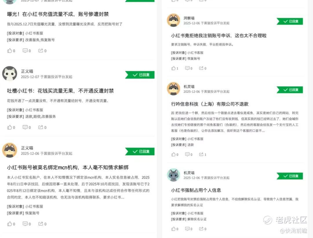 关于小红书的投诉,电商方面涵盖虚假宣传、假货销售、售后失联等多重问题,社区方面涵盖账号异常、无端封禁、信息泄露等等问题。