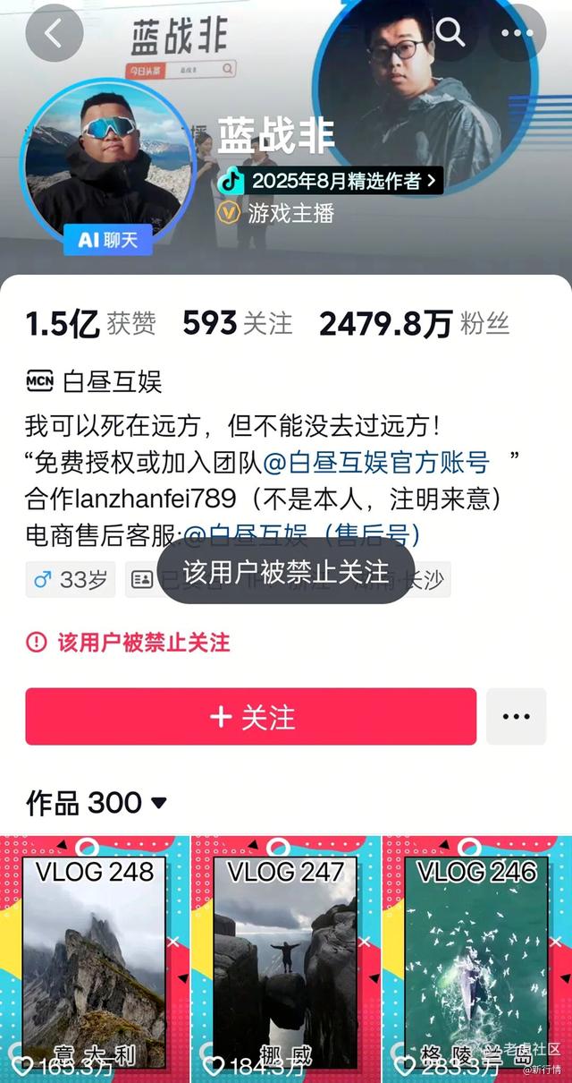 2025年9月,他的抖音、小红书等多平台账号被“禁止关注”。