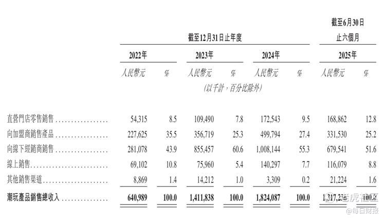 截至2025年中期,TOP TOY共有53家线下经销商,其中最大的一家就是名创优品。报告期内,TOP TOY向名创优品供应潮玩产生的收入,分别占总收入比重为36.8%、53.5%、48.3%及45.5%。