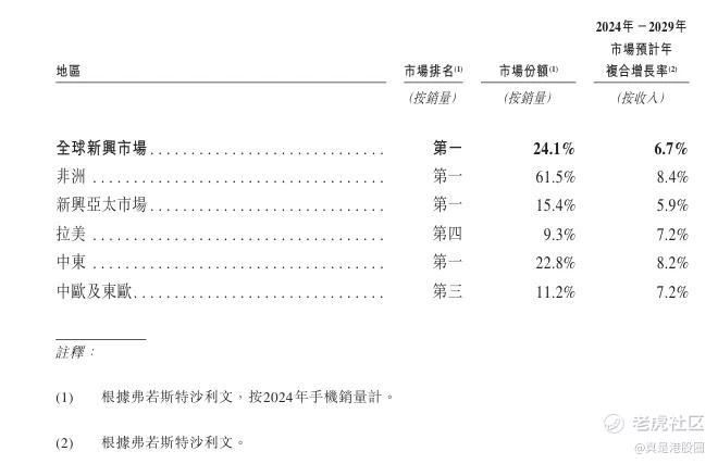 自2013年成立以来,公司就深耕以非洲为代表的新兴市场。凭借着领先的市场占有率和广泛的品牌影响力,在手机行业内有着「非洲之王」的美誉。以2024年手机销量计,公司在非洲排名第一,市场份额达到 61.5%。