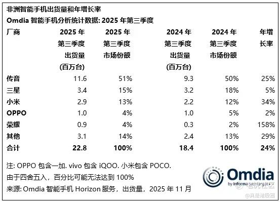 尽管,2025年第三季度传音控股在非洲的手机出货量仍超过1000万部,市场占有率达到51%,稳居第一名的宝座,但同比增长率只有25%。反观小米、荣耀同期增长率分别高达34%、158%。