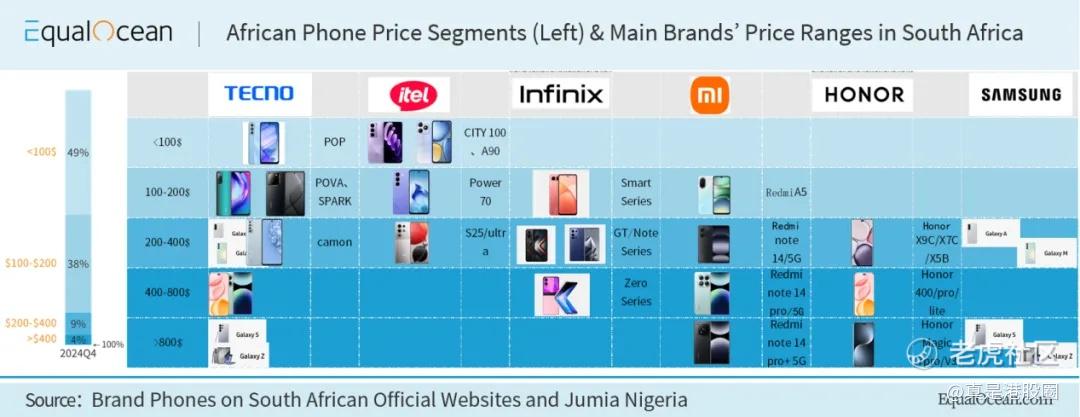 根据IDC的数据,2024年第四季度,售价低于100美元的设备在非洲的出货量占比达到49%,同比增长49%。这一增长除了传音自己外,也与小米和Realme等品牌相继推出的入门级手机有关。