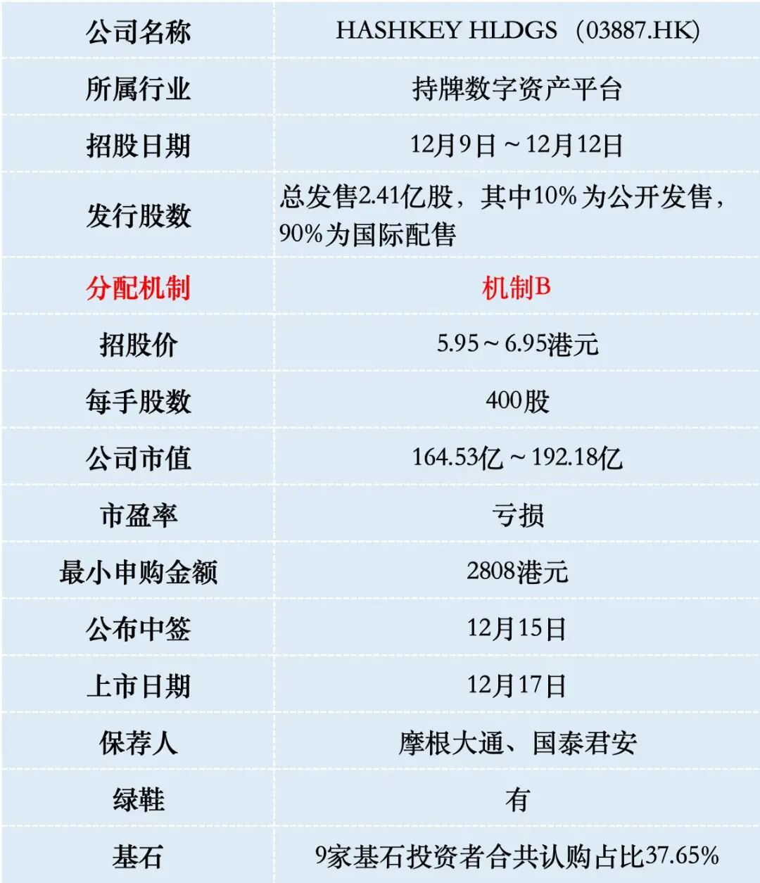 HASHKEY本次IPO发行股份占全部股份比例的8.7%,按招股价上限6.95港元算,募资16.7亿,9名基石投资者锁定5.8亿,流通盘10.9亿。