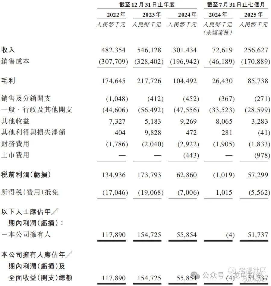 毛利:2022年毛利1.75亿港元,2023年毛利2.17亿港元,2024年毛利1.04亿港元;截至2025年7月31日止最近12个月毛利1.64亿人民币。