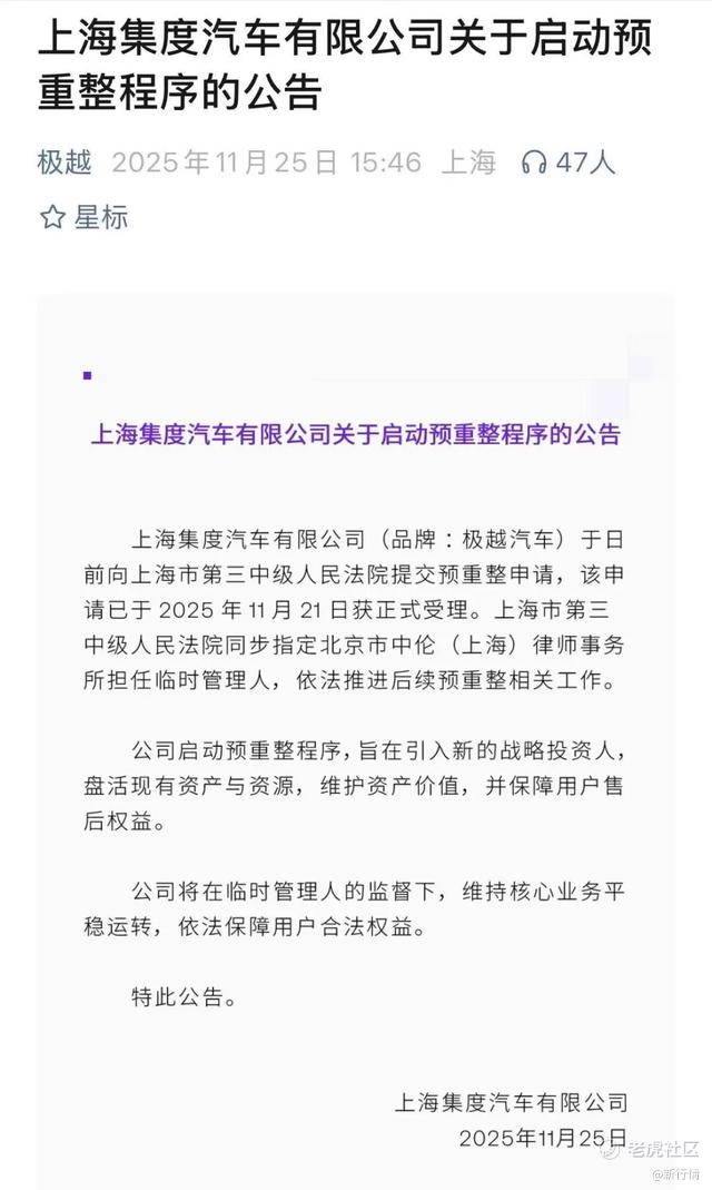 姗姗来迟的极越汽车(上海集度汽车有限公司),也在2025年11月发布了启动预重整程序的公告,希望引入新的战略投资人盘活资产。