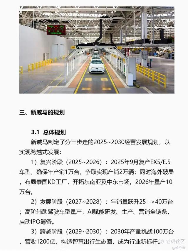 此外,威马汽车还为“复活之路”制定了清晰规划:2025年底产销目标为1万辆,力争达到2万辆;2026年实现满产运行;2027-2028年年销量冲击25万-40万辆,并启动IPO筹备工作;2030年挑战年产100万辆,营收1200亿元的宏伟目标。
