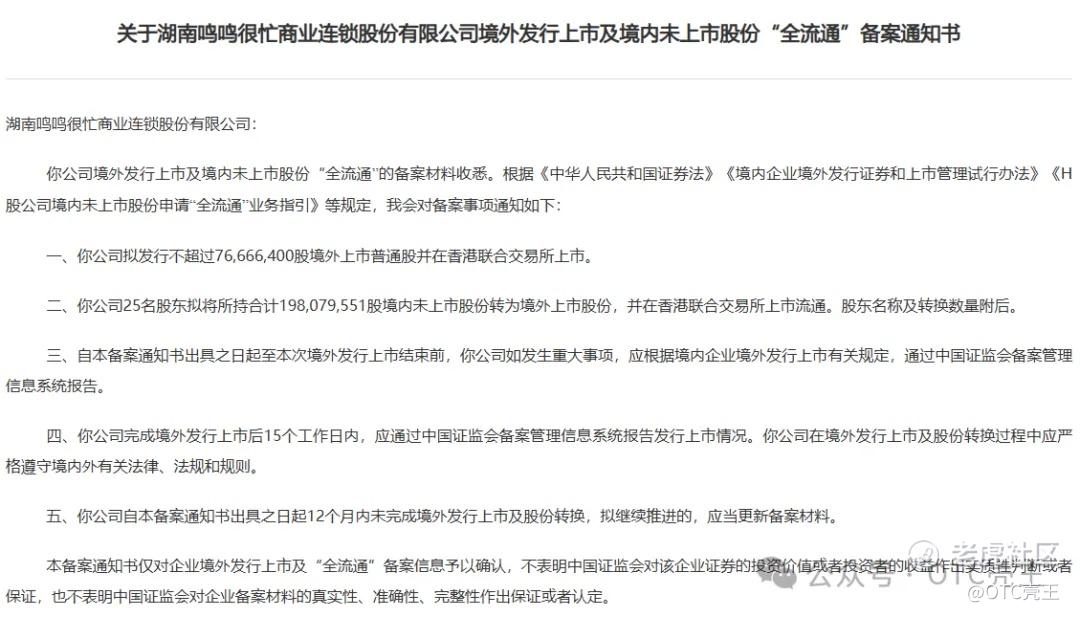 你公司境外发行上市及境内未上市股份“全流通”的备案材料收悉。根据《中华人民共和国证券法》《境内企业境外发行证券和上市管理试行办法》《H股公司境内未上市股份申请“全流通”业务指引》等规定,我会对备案事项通知如下: