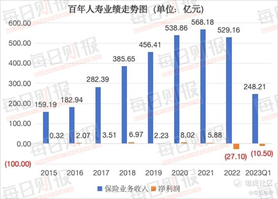 经营业绩层面,根据历年财报数据,2015年至2021年百年人寿保费规模持续保持较迅猛增长势头,且连续实现盈利。但到2022年出现反转,业绩录得双降,不仅保费收入罕见下滑,而且净利润陷入巨亏,全年净利润亏损27.1亿元。2023年一季度,虽然保险业务收入实现同比增长,但净利润却延续了上一年度的亏损态势,亏损达10.5亿元。