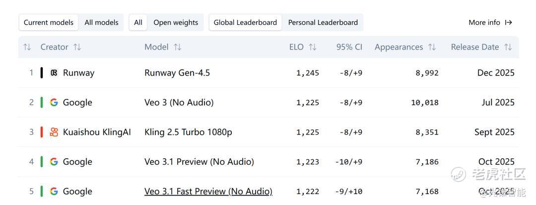 先是Google Veo 3、Veo 3.1凭借原生多模态大模型,实现音画同步和文生视频的提升,成为谷歌又一破圈模型;Runway也在12月2日发布新慢跑鞋gen-4.5,在Artificial Analysis榜单上超过Kling-2.5 Turbo。