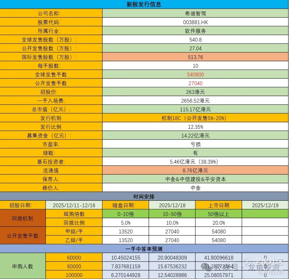 希迪智驾IPO前总共完成8轮融资,最后C+轮完成于2024年12月,每股成本235.11元人民币,交易后隐含估值90.24亿人民币,约合99.6亿港元,较发售价折让17.91%。基石引入5家机构,认购5.46亿港元,占比38.39%,IPO前几个巨头一家没来,红杉和百度要是基石占台那就完全不一样了, 所以一些细节就能看出一只新股的好赖。