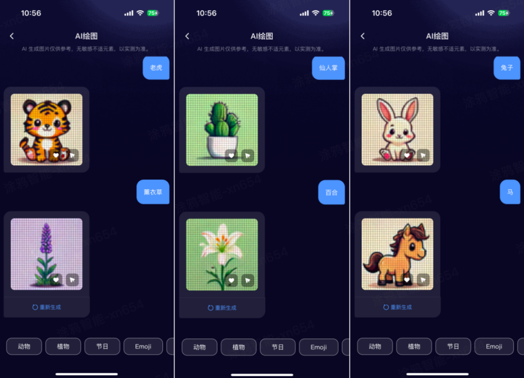 在实际体验中,用户只需在应用中选择想要生成的标签,如“向日葵”、“小鸟”、“仙人掌”等,App 即可在本地进行推理,并在 1~2 秒内快速生成对应的个性化像素风格图案。