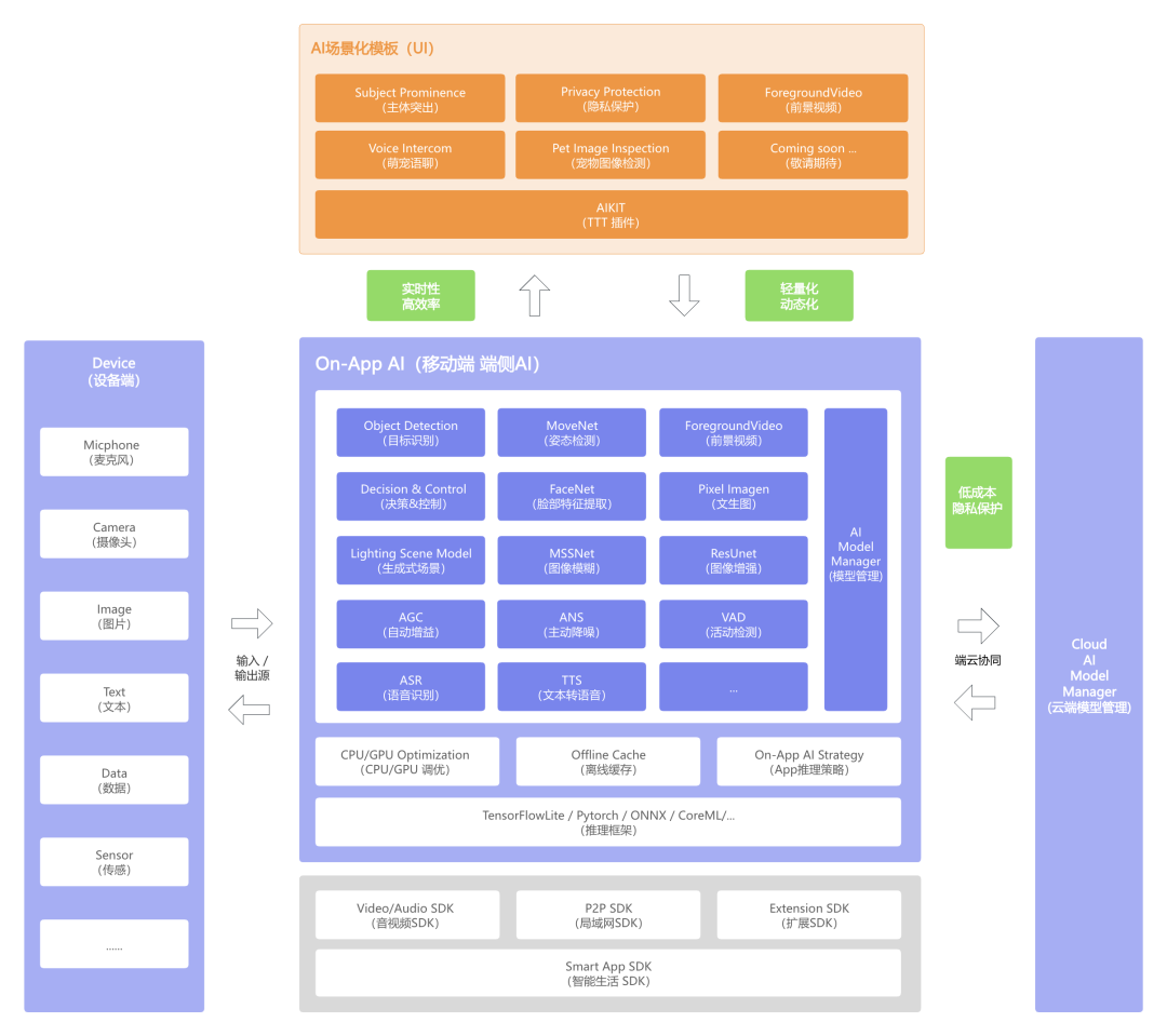 以下是涂鸦智能 On-App AI 整体架构图,包含设备端、云端模型管理、移动端端侧 AI、AI 场景化模板,四大模块。