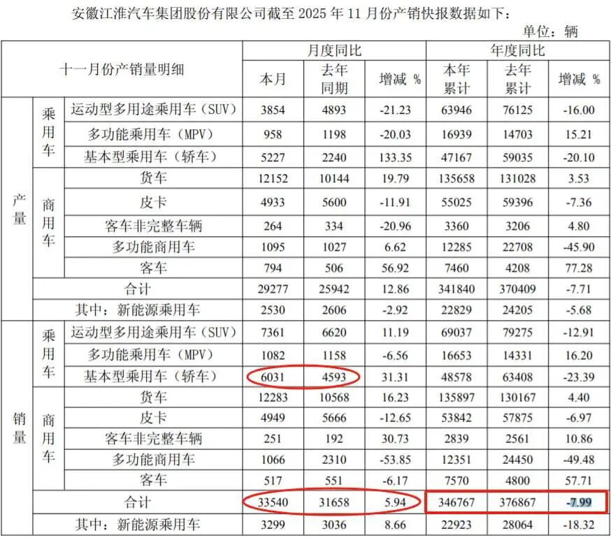 整个11月,江淮汽车乘用车总销量仅14474辆,较去年同期的12371辆增加2103辆。这一增量,与尊界S800当月公布的销量基本持平,意味着除去尊界带来的增量,江淮汽车自身的乘用车销量几乎原地踏步。1-11月,江淮汽车总销量34.67万辆,同比仍下跌7.99%。