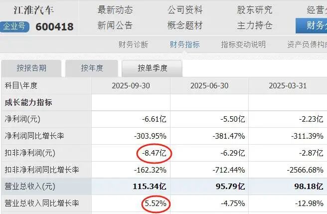 到了今年三季度,随着尊界的批量交付,江淮汽车第三季度(7-9月)营业收入达115.34亿元,同比已转为正增长(+5.52%),但扣非净利润仍处于亏损状态(-8.47亿元)。