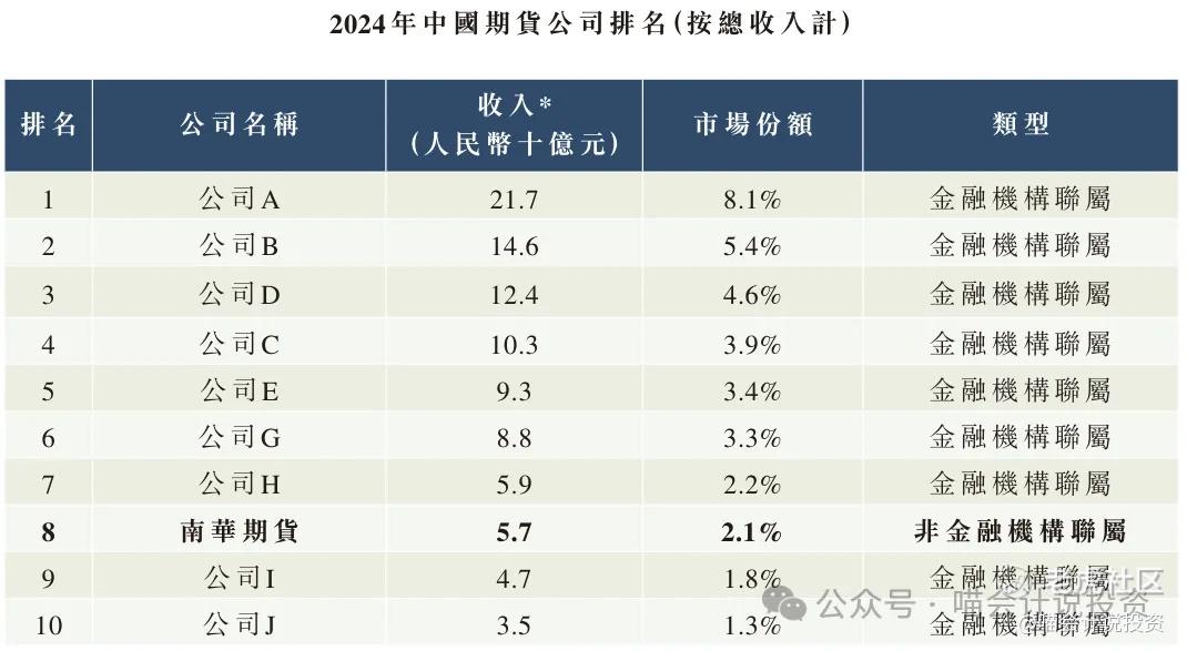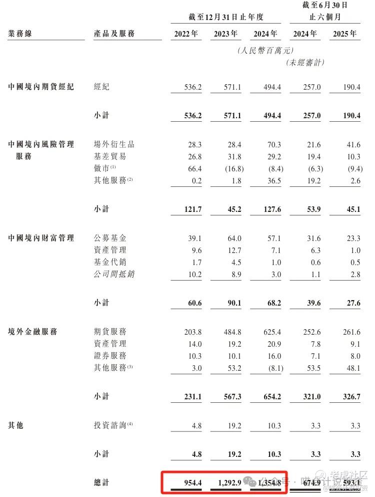 根据弗若斯特沙利文报告,按2024年的总收入57亿元计,公司在中国所有期货公司中收入排名第八,在所有非金融机构相关期货公司中排名第一(就是不算中信期货、华泰期货、国君期货这些)。公司在期货公司里算挺重视海外业务的,目前主要市场包括中国大陆、中国香港、马来西亚、英国等,可能也是发现在国内卷太难了。按2024年的境外收入计,公司在中国所有期货公司中排名第一。