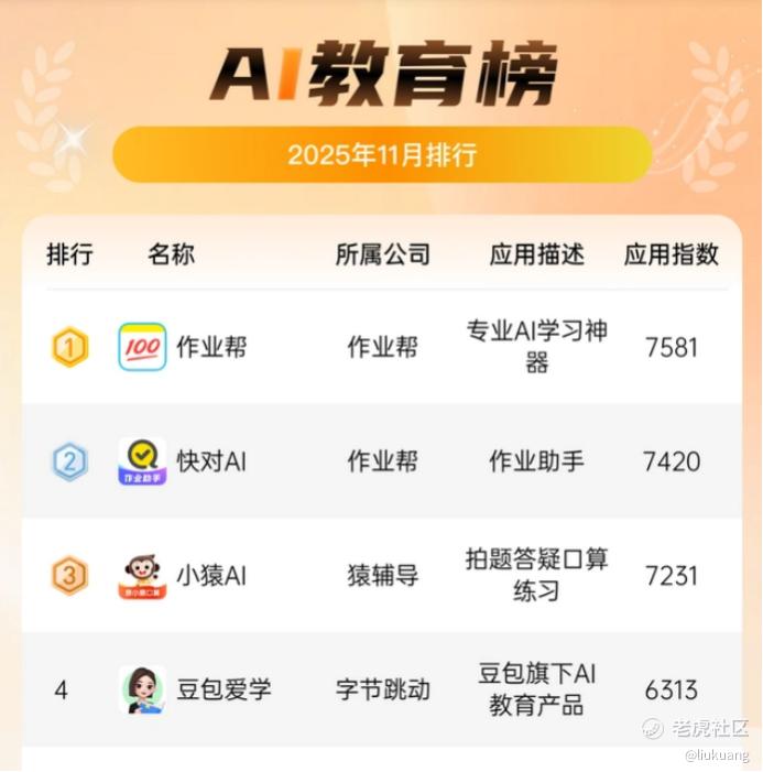 这种基于教育基因的自然转化,构成了作业帮在AI教育赛道上的先发优势。思维火花公众号《11月中国AI应用排行榜》显示,在综合下载量、用户评价、AI原生度和实际体验来构建应用指数排名中,作业帮和旗下快对AI以7581和7420的应用指数排名前列。
