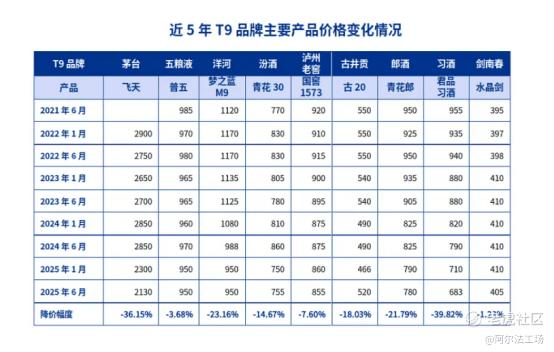 中国酒业协会联合毕马威发布的《2025中国白酒市场中期研究报告》显示,在代表中国最顶级白酒品牌的T9阵营中,君品习酒批价从2021年6月的955元/瓶,持续下行至2025年同期的683元/瓶,累计跌幅达39.82%,为该阵营中跌幅最大的单品之一。