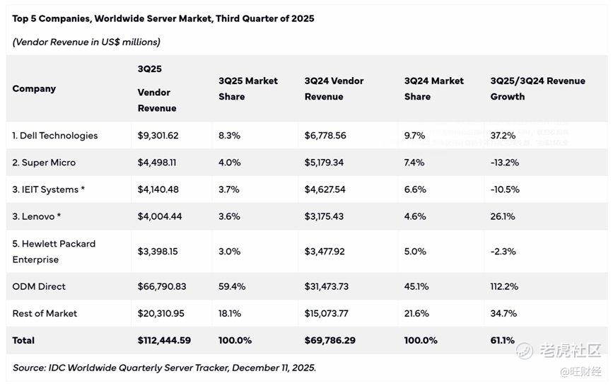 智通财经APP获悉,近日,IDC发布的《全球服务器市场季度追踪报告》显示:2025年第三季度服务器市场收入达到创纪录的1124亿美元,同比猛增61%,再次创下两位数高增长率。其中联想集团(00992)以稳健表现跻身全球服务器市场前三阵营,核心指标呈现显著竞争优势:营收同比增长26.1%,在头部企业中增速领先,与浪潮科技并列市场第三,成为全球服务器市场增长的核心动力之一。