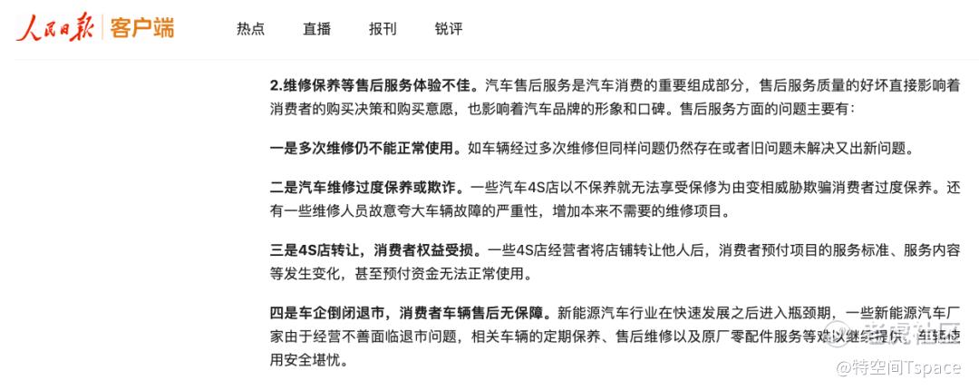 《人民日报》曾在报道中指出,传统车企4S店的售后服务存在多种问题,如多次维修仍不能正常使用、车辆维修过度保养或欺诈等。