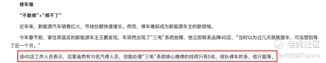 据《重庆日报》报道,一位新能源车主因三电系统故障,车辆在4S店维修长达一个月。工作人员对媒体表示:“店里虽然有10名汽修人员,但能处理三电系统维修的技师只有5名,只能等。”