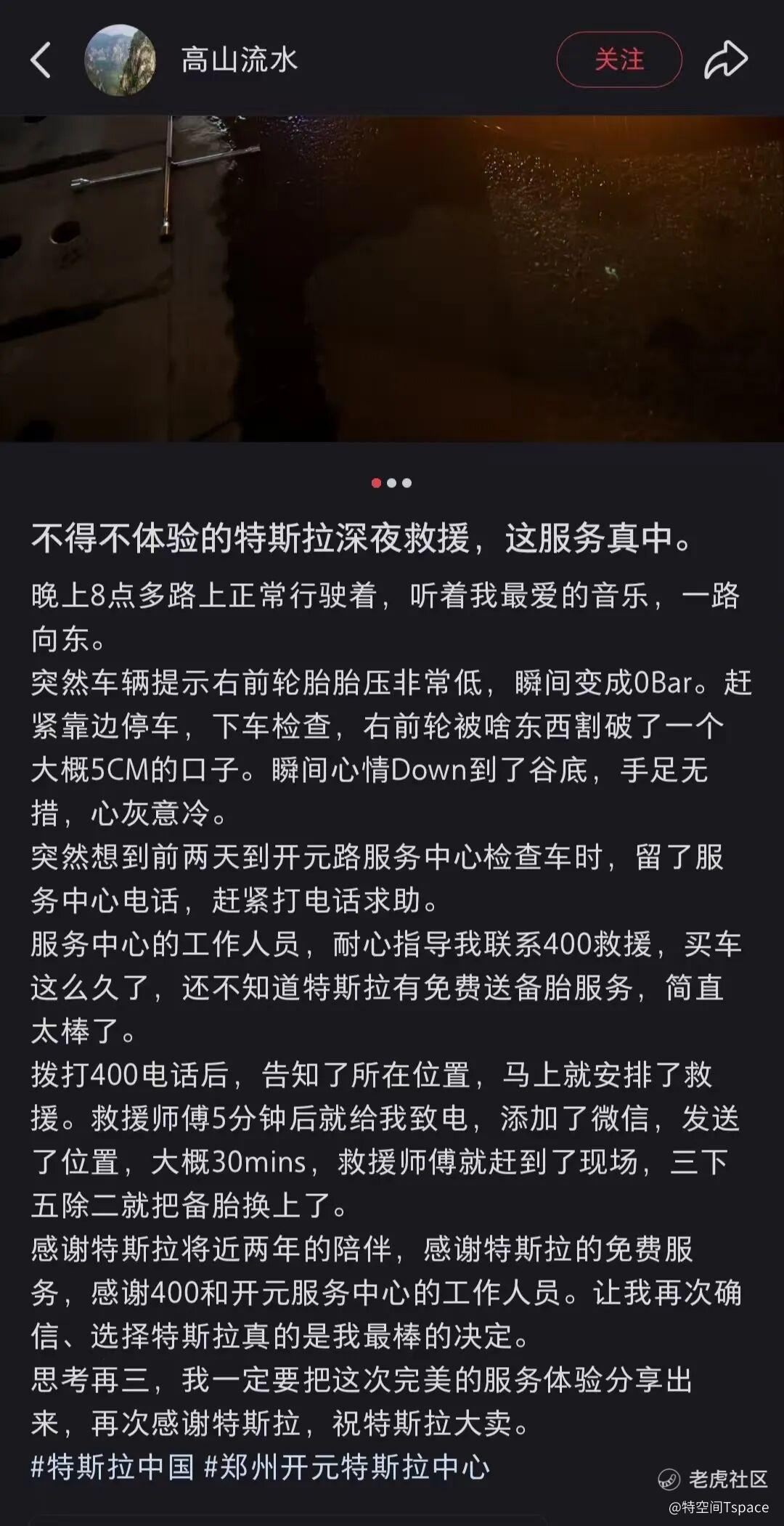 网友@高山流水 分享了自己的亲身经历,“打完救援电话后,大约30分钟师傅就到了。最让我惊喜的是特斯拉竟然提供免费备胎服务。贴心的服务体验让我更确信,选特斯拉是最棒的决定”。