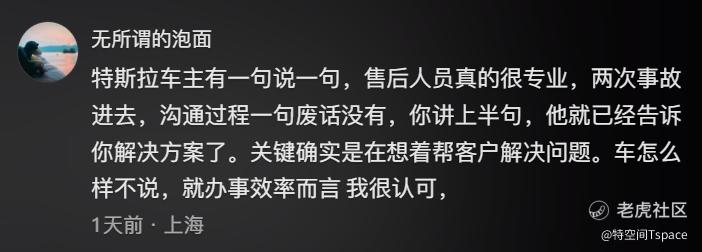 “特斯拉的售后人员真的很专业,两次事故,沟通过程一句废话没有,可以迅速给出解决方案。”