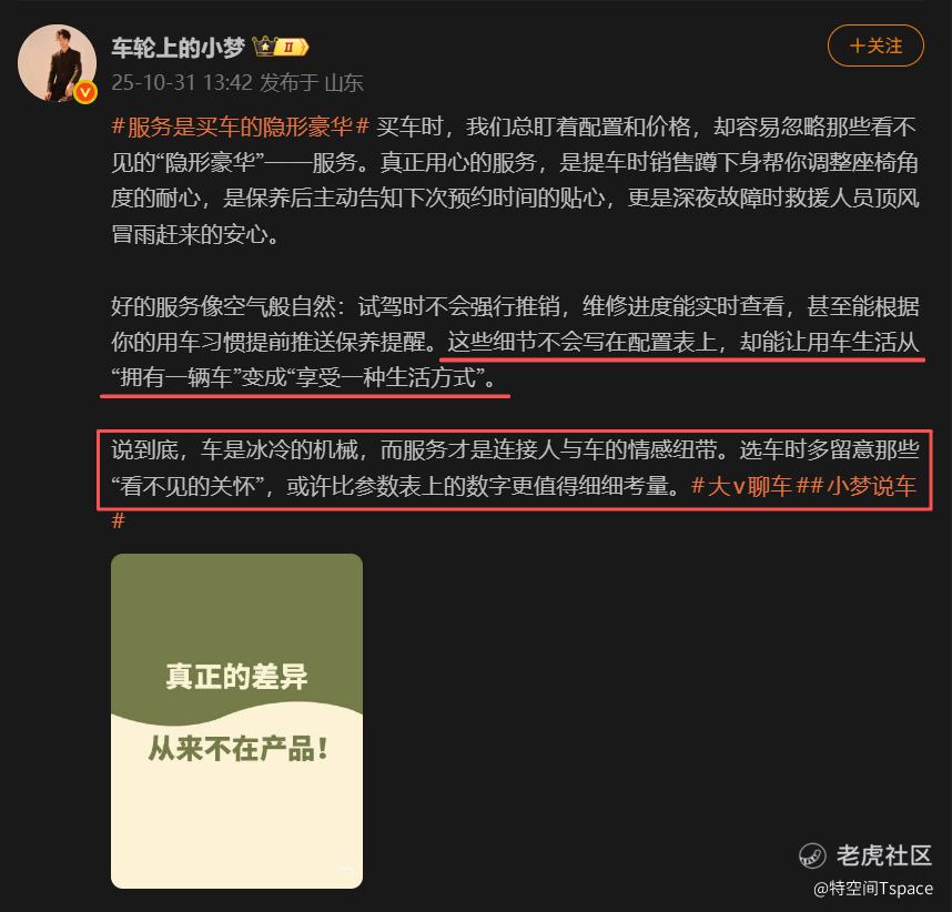 优秀的服务可以让用车生活“从拥有一辆车”变成“享受一种生活方式”。正如网友@车轮上的小梦 所说:“车是冰冷的机械,但服务连接的是有温度的生活。选车时多留意那些看不见的关怀,这远比参数表上的数字更值得关注。”