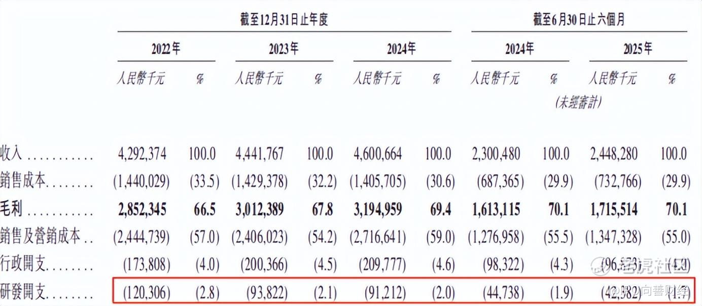 招股书显示,2022年至2025年上半年,自然堂本就不多的研发费用率逐年走低,分别为2.8%、2.1%、2.0%与1.7%。