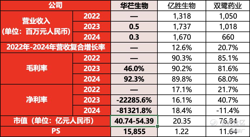 估值层面,华芢生物当前市值约40.74–54.39亿元,高于亿胜生物的20.35亿元但低于双鹭药业的76.84亿元;由于收入几乎未放量,华芢生物PS高达15,855倍,显著高于亿胜生物的1.22倍与双鹭药业的11.64倍。这意味着市场对华芢生物的定价本质上更多押注于后续产品放量与商业化兑现而非现有经营基本面,如果将双鹭药业的PS作为预测估计值,华芢生物的未来的年营业收入需要达到4.09亿元人民币,华芢生物若能达到,市值还将继续上升,反之则会有较大压力。